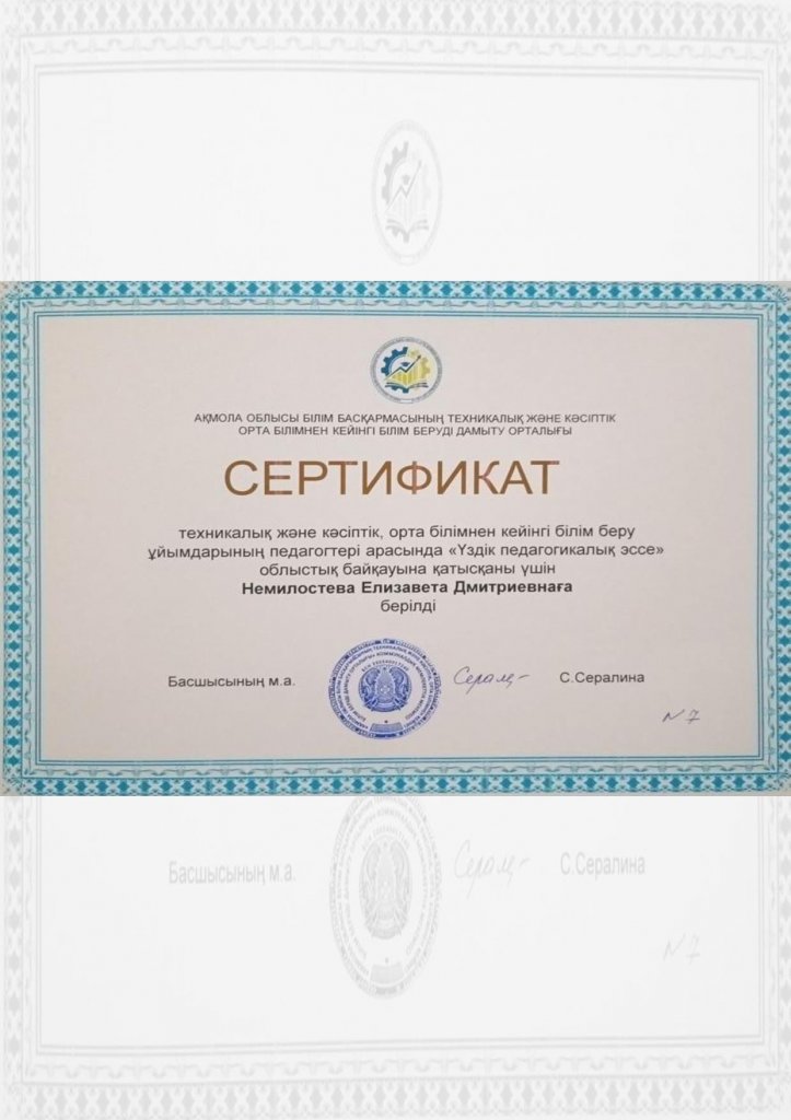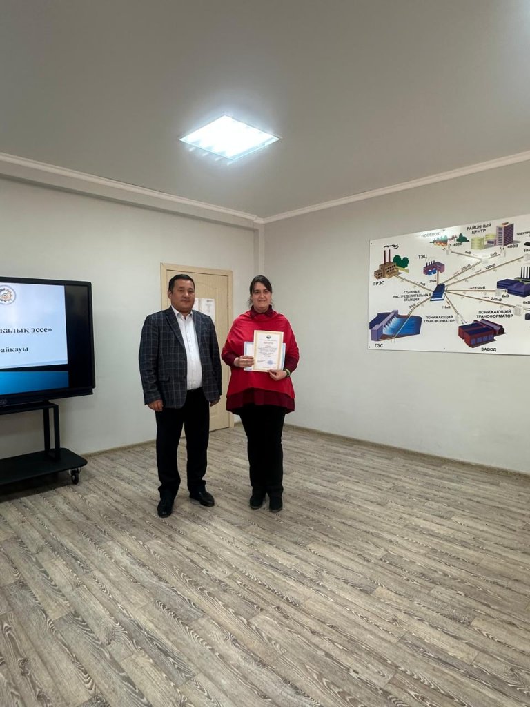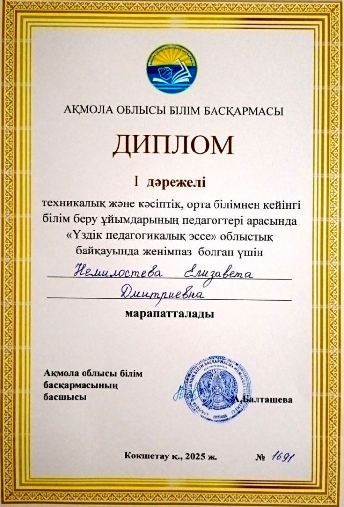 Ағылшын тілі пәнінің оқытушысы Немилостева Елизавета Дмитриевна облыстық "Үздік Педагогикалық эссе" конкурсының жеңімпазы атанды және 1 дәрежелі дипломмен марапатталды. Конкурстың мақсаты: педагогтердің шығармашылық белсенділігін ынталандыру; озық педагогикалық тәжірибені насихаттау; педагогикалық идеялармен алмасу үшін жағдай жасау; өз ойларын жазбаша түрде жеткізе алатын талантты авторларды анықтау. "Үздік Педагогикалық эссе" конкурсындағы лайықты жеңісіңізбен шын жүректен құттықтауымызды қабыл алыңыз! Бұл жетістік сіздің педагогикалық өмірбаяныңыздағы жарқын бет болсын, жаңа жетістіктер мен шығармашылық жаңалықтарға шабыт берсін!