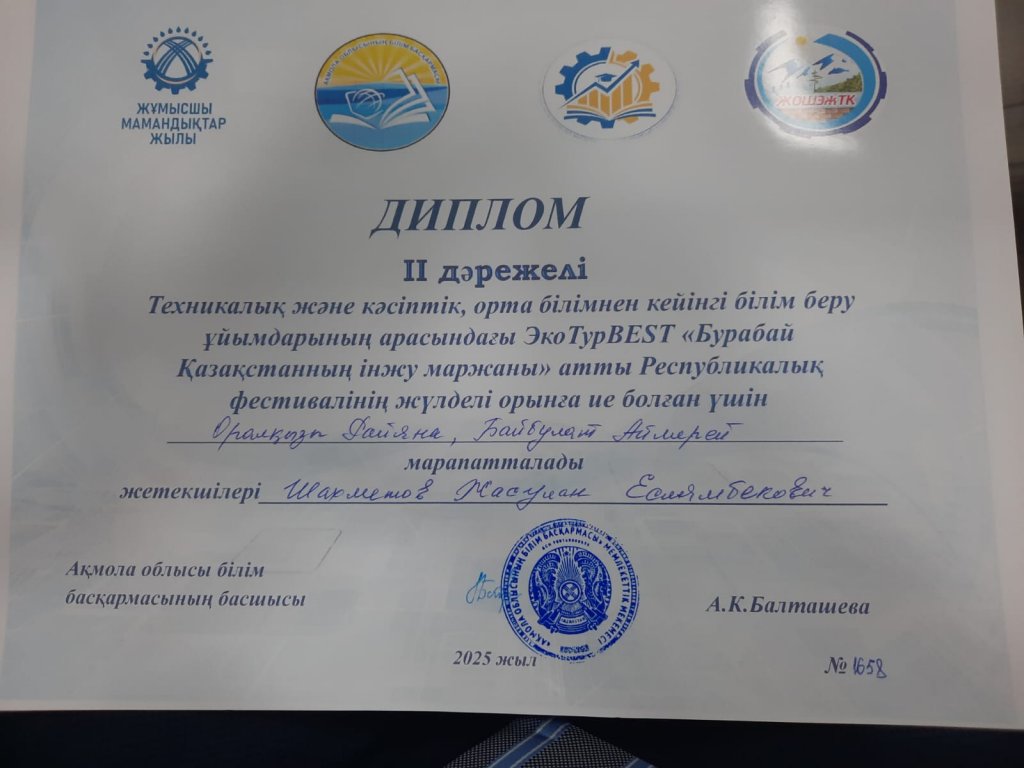 23 қазанда Жоғары педагогикалық колледж студенттері "Орман шаруашылығы, экология және туризм жоғары колледжі, Щучинск қаласы, Бурабай ауданы" МКҚК базасында ұйымдастырылған "Бурабай Қазақстанның інжу маржаны" Экотурвеѕт республикалық фестиваліне белсенді қатысты. "Ғылыми және зерттеу жобаларын қорғау "секциясында "Табиғат тарихының турлары " бағыты бойынша А-12 және РФ-21 топтарының студенттері сөз сөйледі. 2 дәрежелі дипломмен "Бурабай-халық мұрасы" тақырыбындағы жобаны ұсынған А – 12 тобының студенттері Оралқызы Райана, Байболат Аймерей марапатталды , ғылыми жетекшісі Ж. Е. Шахметов. Голымбовская Ольга мен Байқадамова Наргиз (РФ-21) "Бурабай Марал фермасына Экскурсия: "табиғатпен үйлесімділік жолы" жобасымен өнер көрсеткені үшін, жетекшісі Бабаева А.Т., Алғыс хатпен марапатталды. "Жаратылыстану және гуманитарлық ғылымдардың кездесу орны" бағытында А-31 тобының студенті Макарушкина Анастасия "Жоқ Қала: Чернобыльдің экологиялық мұрасы"тақырыбында сөз сөйлеп, сертификатпен марапатталды , ғылыми жетекшісі Р. К. Бекмағамбетова. Іс-шараға қатысу біздің студенттердің экологиялық проблемаларға деген қызығушылығының артуын көрсетеді, өңірді дамыту мәселелері бойынша тәжірибе мен идеялармен алмасуға және туристерді тартуға ықпал етеді. Құрметті республикалық фестивальға қатысушы студенттер! Щучинск қаласының жоғары педагогикалық колледжіндегі әрбір жаңа күндеріңіз Сіздерге сарқылмас қуат, шабыт және қуаныш әкелсін!